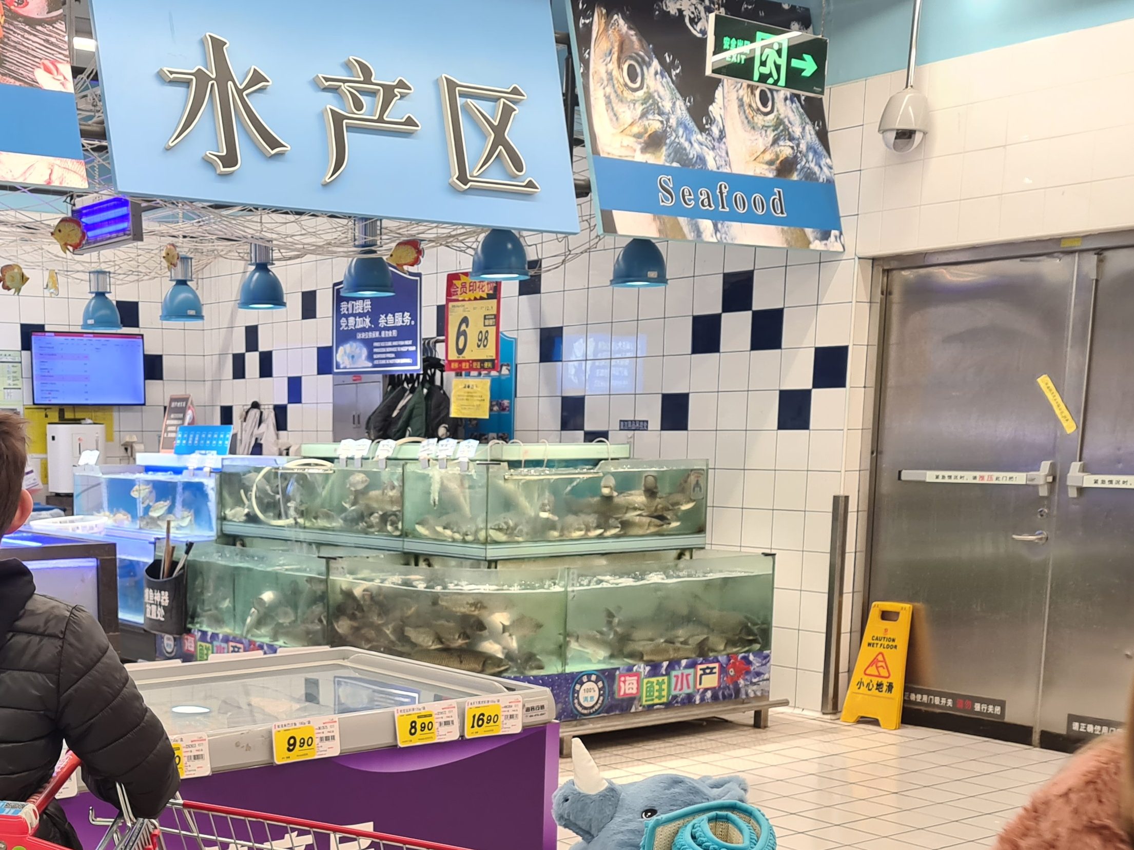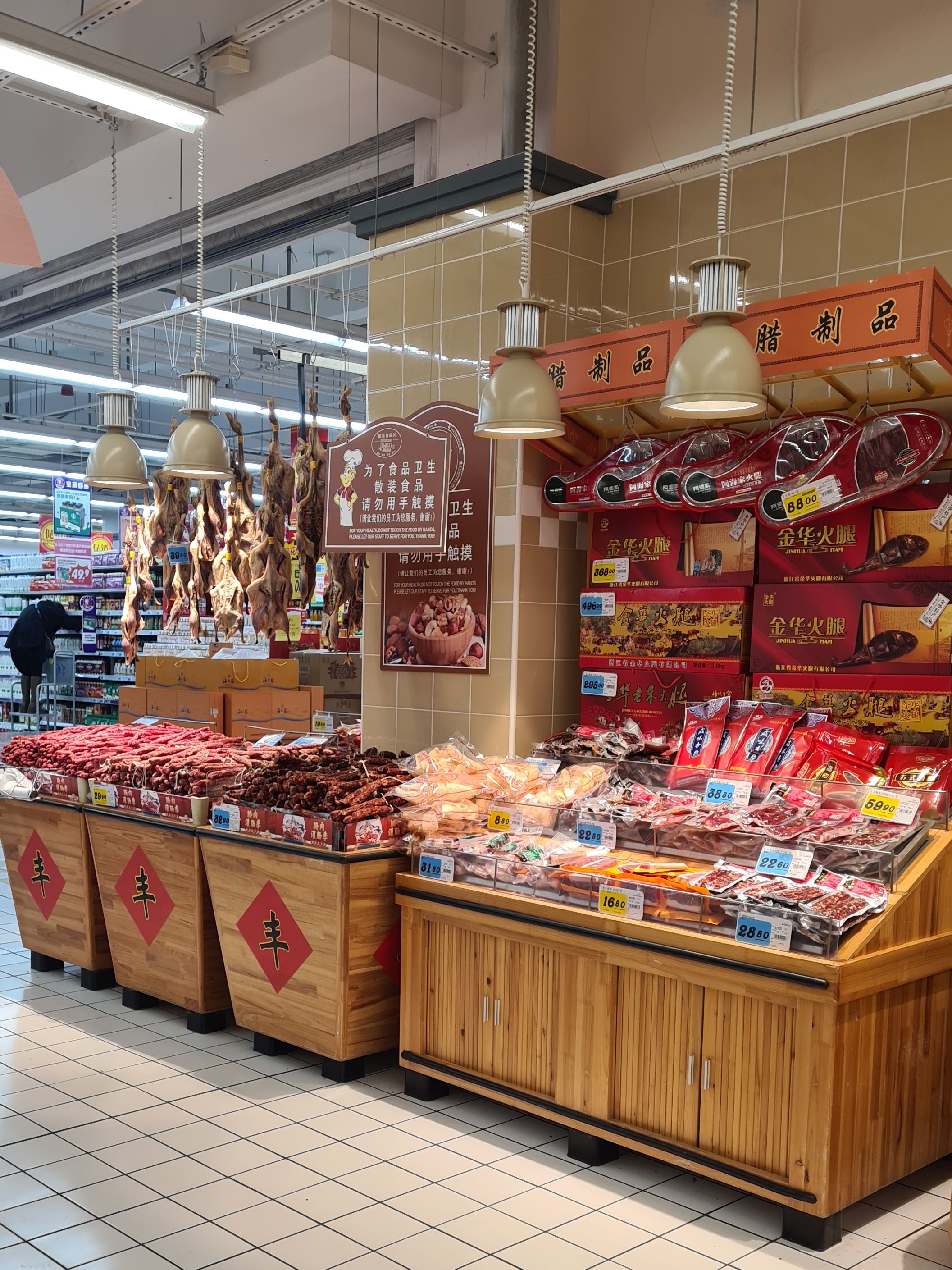 I mataffären kan du köpa nästan vad som helst, i alla fall om du kan kinesiska. Kan du inte det kommer du ganska långt med en översättningsapp. Det är fullt av personal som gärna följer efter dig för att hjälpa till. Bland annat finns alla möjliga sorters torkade djur och djurdelar att köpa, som hönsfötter, hela ankor, fiskar i akvarium och mycket mer.