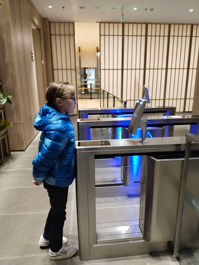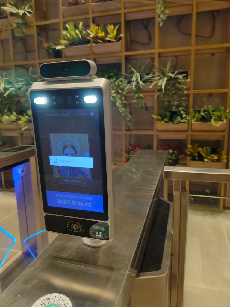 Låsa upp med ansikte och fingrar, vi har inga nycklar till ytterdörren utan för att komma in i vårt bostadsområde, gymmet eller vår port läses ansiktet av. “Kai suo shun guo” eller unlocked door. Det sitter kameror nästan överallt som kan registrera brott som sker eller så.
