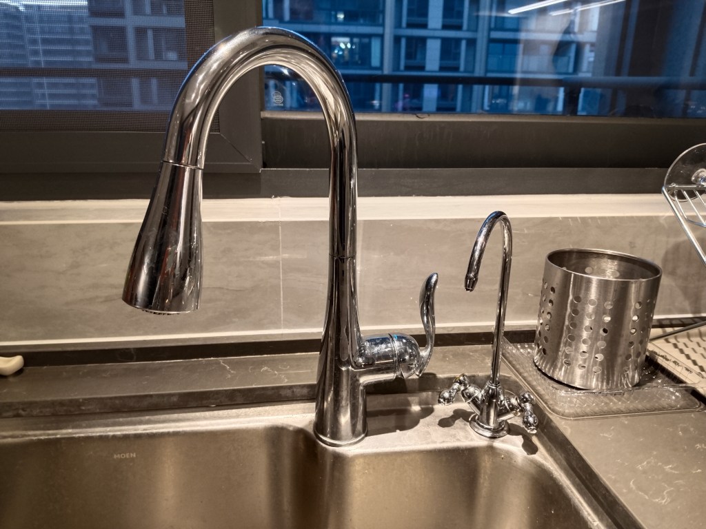 Vattnet i köket är en annan grej vi inte är vana vid. Kranen längst till vänster är diskvatten, det är inte drickbart, utan smakar kemiskt om du skulle glömma bort dig och hälsa upp ett glas. Det går att få både varmt och kallt och är samma som finns i duschar och handfat. I mitten sitter guldkornen där vattnet passerar genom ett filter under diskbänken. Det är drickbart, smakar inget konstigt och är rumstempererat. Längst till höger sitter silverkranen, för att skölja grönsaker i, vattnet leds i samma kran som det drickbara. Jag misstänker att den är lite semi-filtrerad på något sätt.