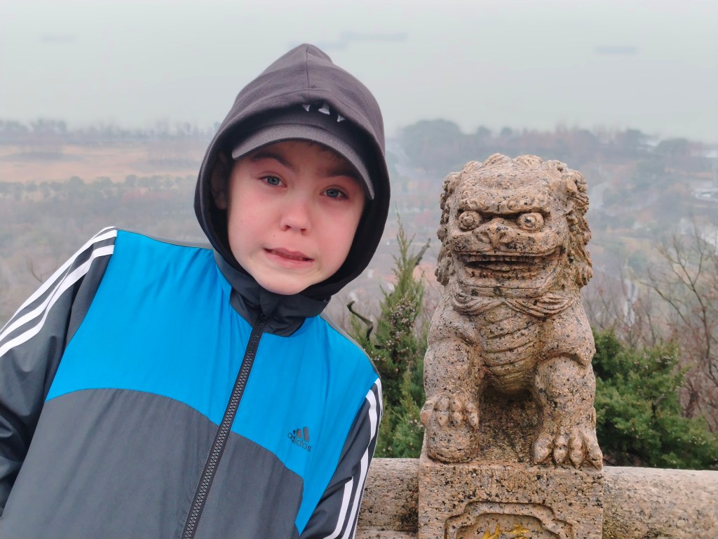 I lördags var familjen ledig tillsammans och vi passade på att göra en utflykt. Att vädret visade sig från en sämre sida försökte vi bortse från och trotsade de kalla vindarna. Luftkvaliten var ju toppen, bäst att passa på! Målet för dagen var Wolf Mountain, ett berg strax söder om stadskärnan som härbergerar ett tempel och gränsar till Yangtzefloden. Så möjligheten fanns för både både natur- och kulturupplevelse.
