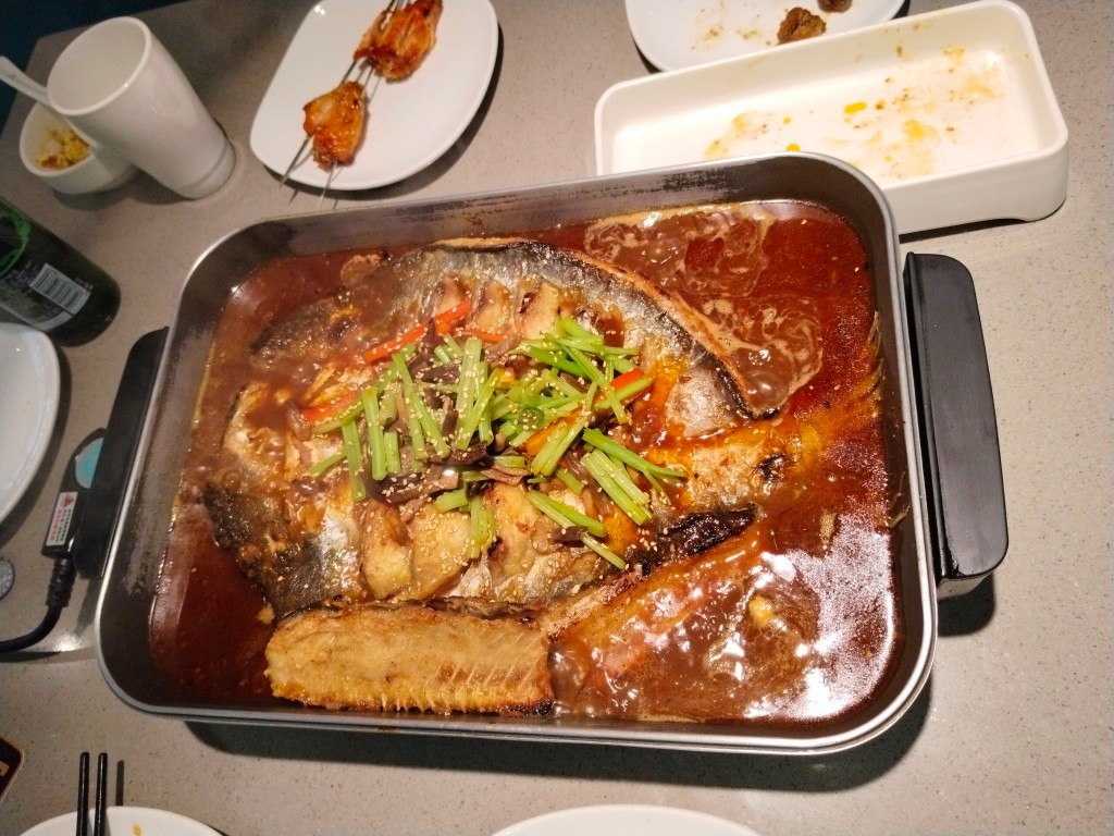 Fisken kokade när vi fick in den på bordet, och mer vätska tillsattes när det började koka bort. Det tar lite tid att äta fisk med pinnar, den kokades mör så att den föll isär, men benen försvann tyvärr inte. Väldigt gott måste tilläggas! Även barnen var nöjda med sina olika grillspett och fri tillgång på dryck, ris och sockrade popcorn.