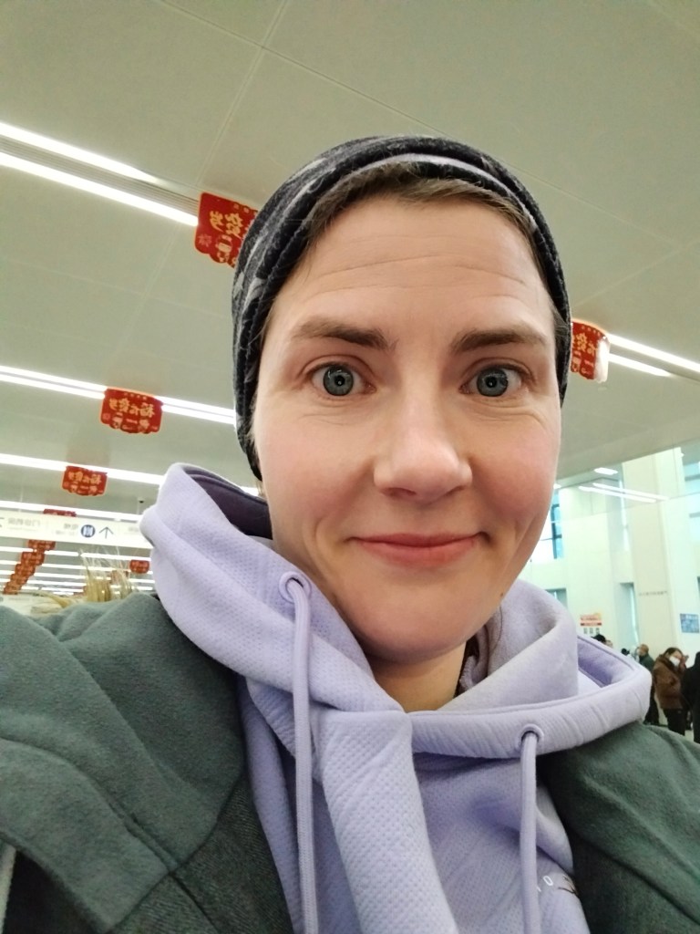Jag i sjukhusfoaje med nyårsprydnader i taket