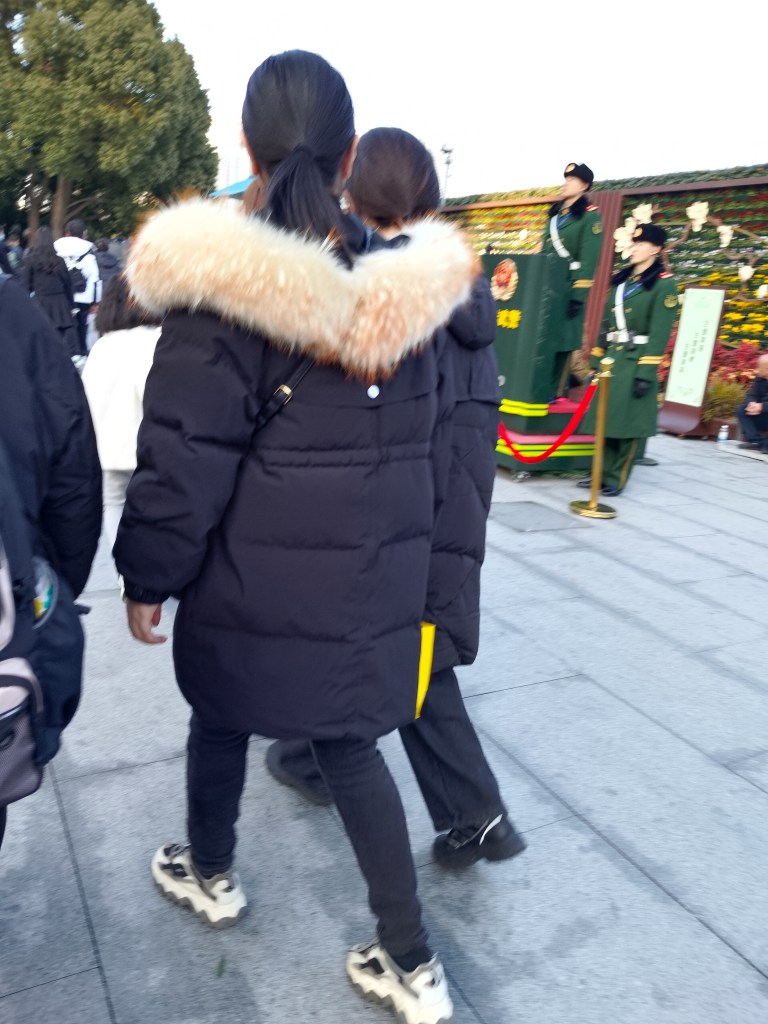 Vi gick vid detta tillfälle i T-shirt och en långärmad tröja, för det var ca 16 grader varmt. Kineserna kör alltså dunjacka, eller vinteruniform trots detta, och dagen därpå i 23 grader hade de samma utstyrsel.