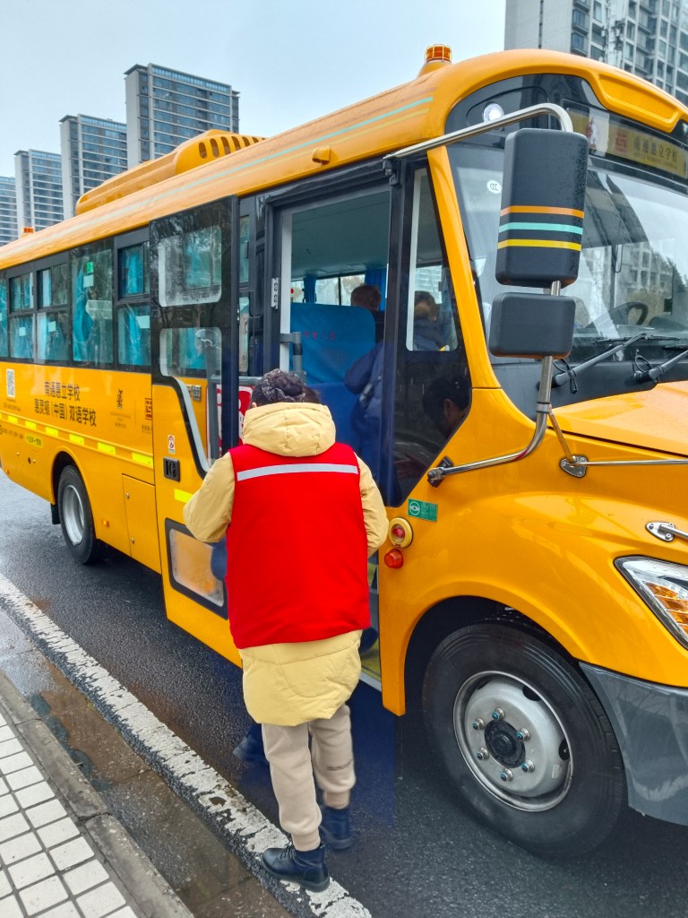 Äkta gul skolbuss med blinkande gula lampor på taket så att den syns ordentligt. Ingrid får sitta bredvid svenska Charlie som går i klass 2, perfekt. Olof däremot får inte sitta bredvid någon av sina två klasskompisar i 6an utan är placerad med en kinesisk 7åring som han inte kan prata med. Och detta är inte förhandlingsbart. Han försökte göra lite läxa på bussen med det fick han inte för Renxiaoli, det är hon som styr på bussen. Och vi har ju lärt oss nu att det inte är någon idé att ifrågasätta.