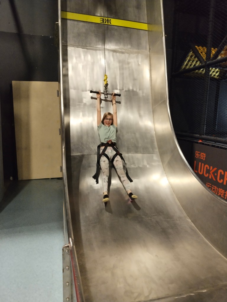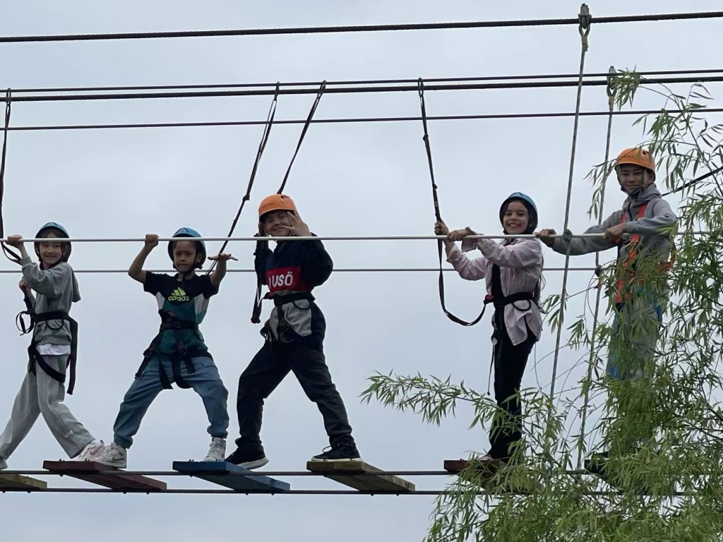 Efter maten nya aktiviteter som hängbro och att åka linbana över vattnet.