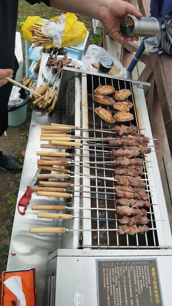 Sedan var det mat i ofantliga mängder. Det hade räckt till en tredje klass. Pizzor och allehanda spett med kött, kyckling, grönsaker, bläckfisk, frukt och frön, vatten och öl. Kycklingfötter smakade bra, men var väldigt segt.