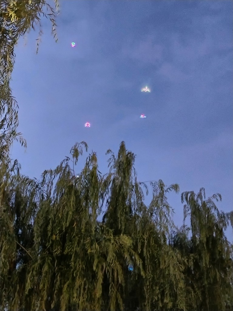 På långt håll kunde vi också se drakar flyga i luften, dekorerade med LED lampor. Utanför den anrika restaurangen Gyllene Måsen satt en man på en stol och styrde en av drakarna, bekvämt på en plaststol.