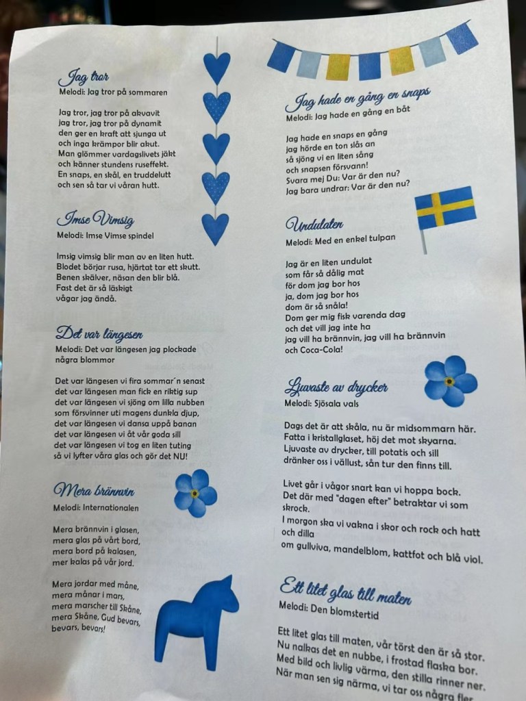 Snapsvisor avlöstes av midsommarquiz (som mitt lag vann) och musikquiz som vi inte vann.