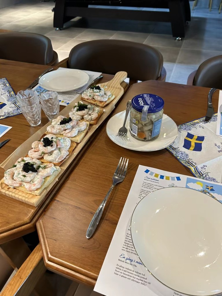 Två scaniaanställda och barteamet hade jobbat på och gjort det väldigt fint. Lyckats med direktimport av sill, och min gubbe lyckades hitta akvavit till nubben.