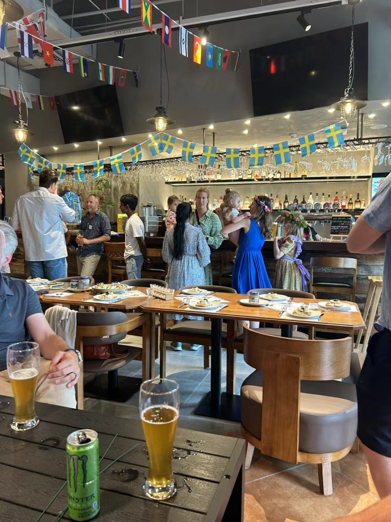 På lördag blev det dock lite mer “riktig” midsommar här. Regnet fortsatte, både hällande och duggande. Olof körde terminens sista fotbollsträning på skolan och när han kom hem hade midsommarlunchen börjat på den närliggande, nyöppnade baren.