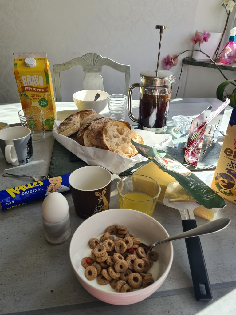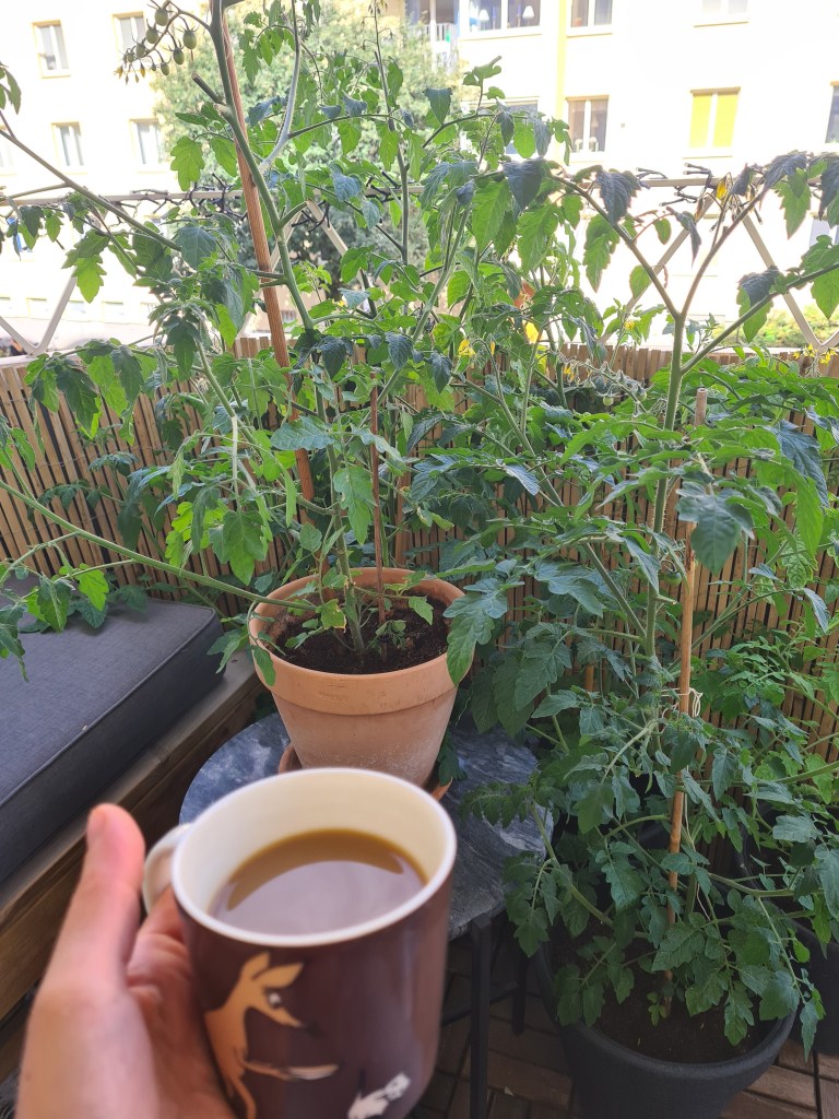 Frukosten när vi väl vaknat med surdegsfralla och kaviar på ägget var en av mina bästa på länge. Kaffe bland Jennys tomater var också en hit.