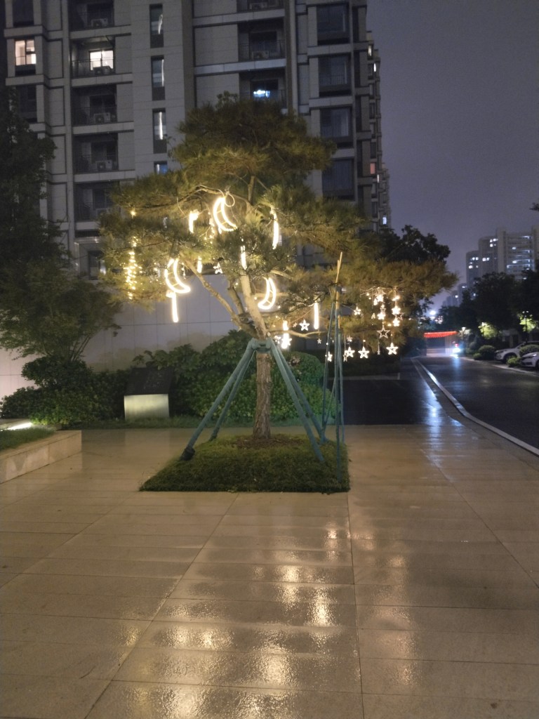 Förutom detta välarbetade konstverk i rött grus i botten av spegelpoolen (5 cm djup) smyckas också tallarna med vad jag skulle kalla för juldekorationer. Månar och stjärnor som blinkar. Vi får se hur länge de får sitta uppe.