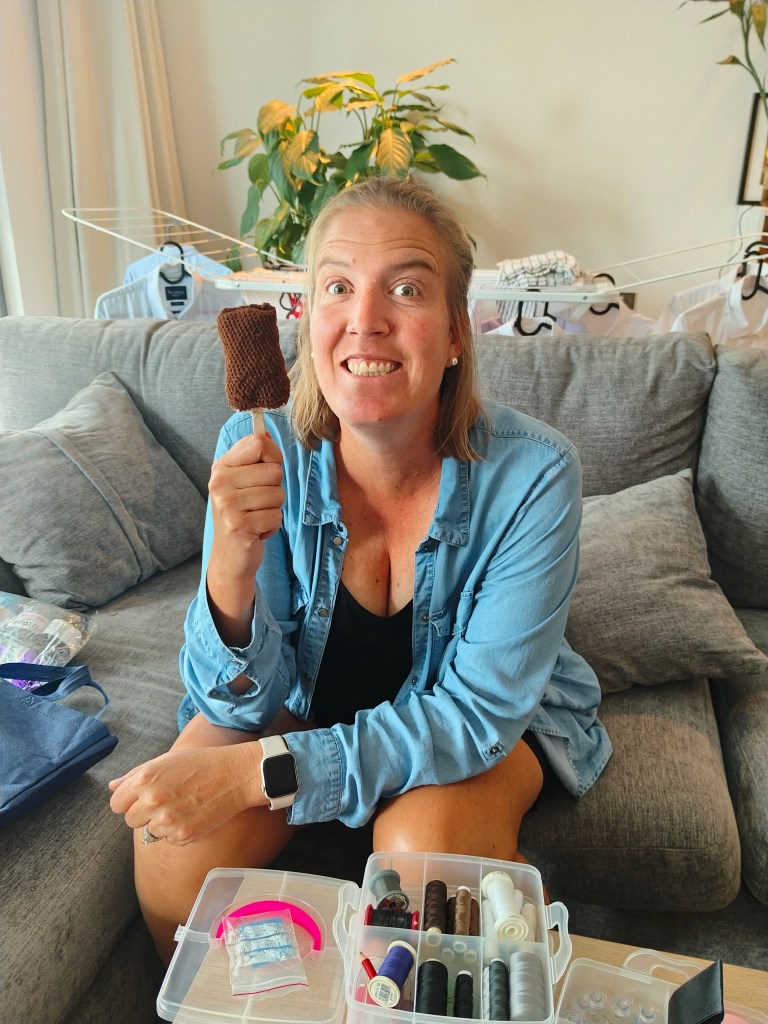 De bjöds på fläskfile gratinerad under en grönsaksstuvning med pressad potatis och kokta morötter till. Till kaffet jobbade vi en stund med handarbete, Linda färdigställde sitt allra första virkprojekt, en chokladglass, och Sara som haft en halv yllesocka liggande i minst två år blev nästan färdig, fick lära sig att sticka en häl.