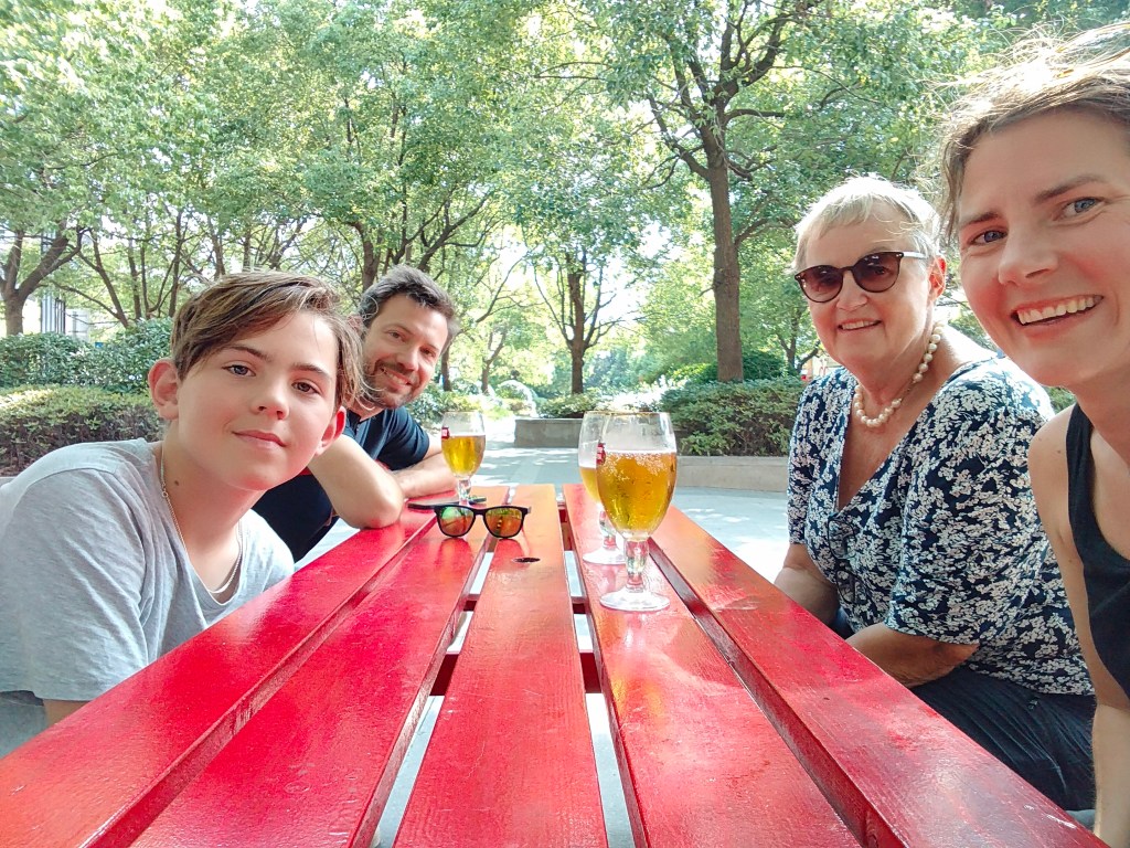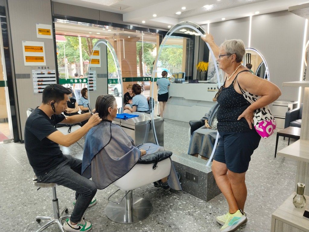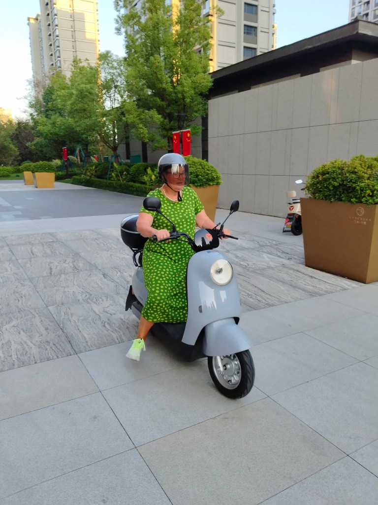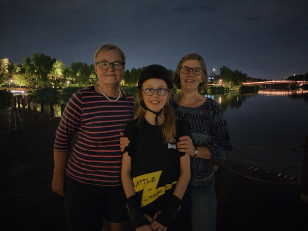 Otroligt vackert i parken nedanför berget Langshan där solen gick ner under tiden vi hade lektion. Nu har vi skrivit upp henne på och betalat för 20 lektioner, hon är väldigt nöjd. Den äldre Jet-laggade släktingen som kunde passa på att sova några minuter i en liten stol var också nöjd.