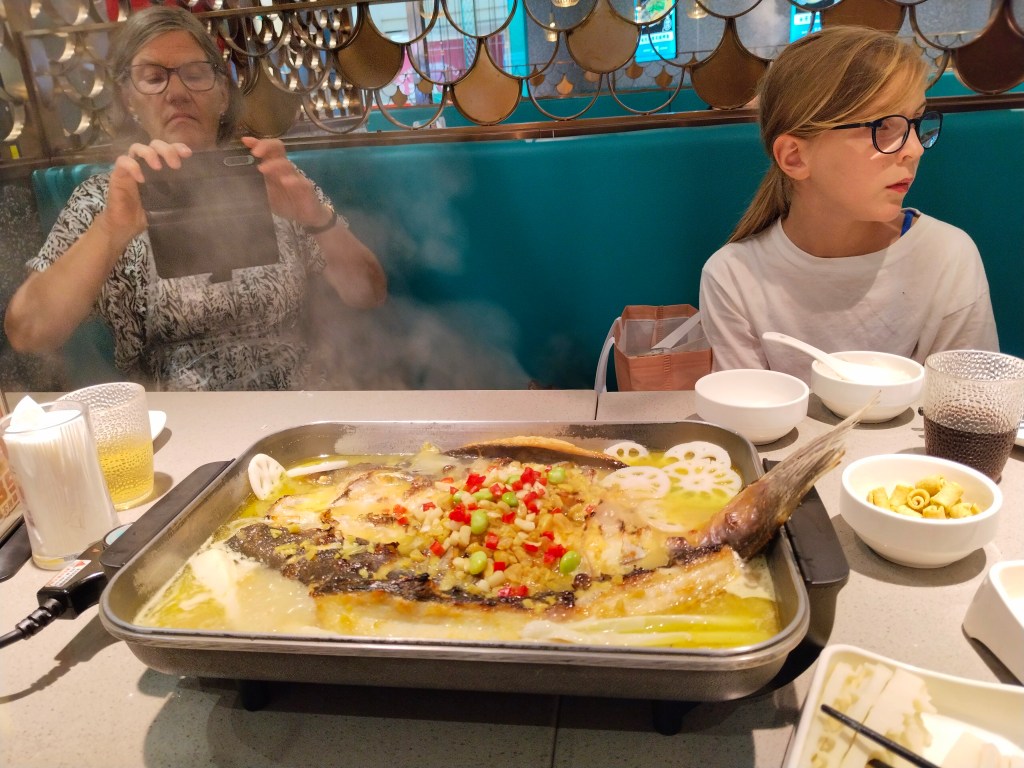 Vi har också ätit mat på olika restauranger. Grönsakspannkaka för 10 元 var en hit på sitt sätt, och fiskrestaurangen var en hit på ett annat sätt. Fisken kom in i eluppkopplad form på bordet där den lagades klart tillsammans med grönsakerna vi beställde in.