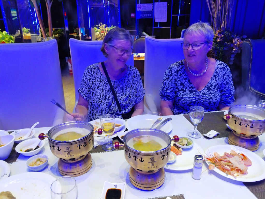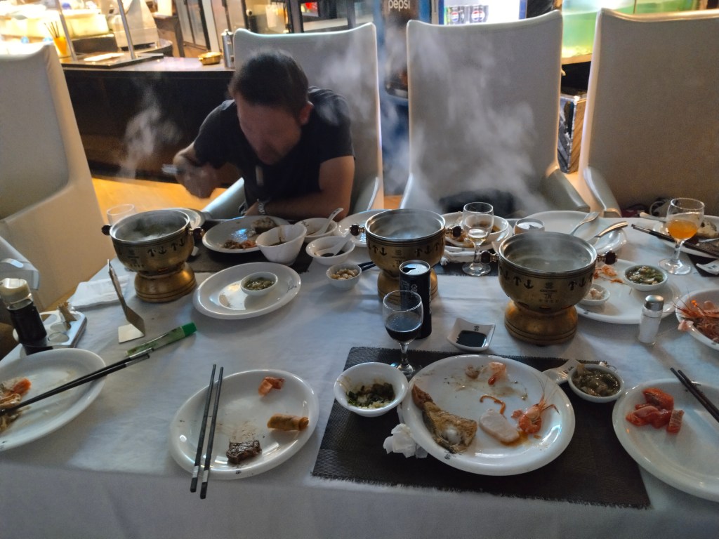 Uppe på våning 26 i ett hus i stan fanns en bufférestaurant belägen på ett snurrande våningsplan med stora fönster. Vi fick ett bord med en varsin liten kokande kittel att tillaga vissa rätter i och andra rätter hade kockarna redan gjort klart.