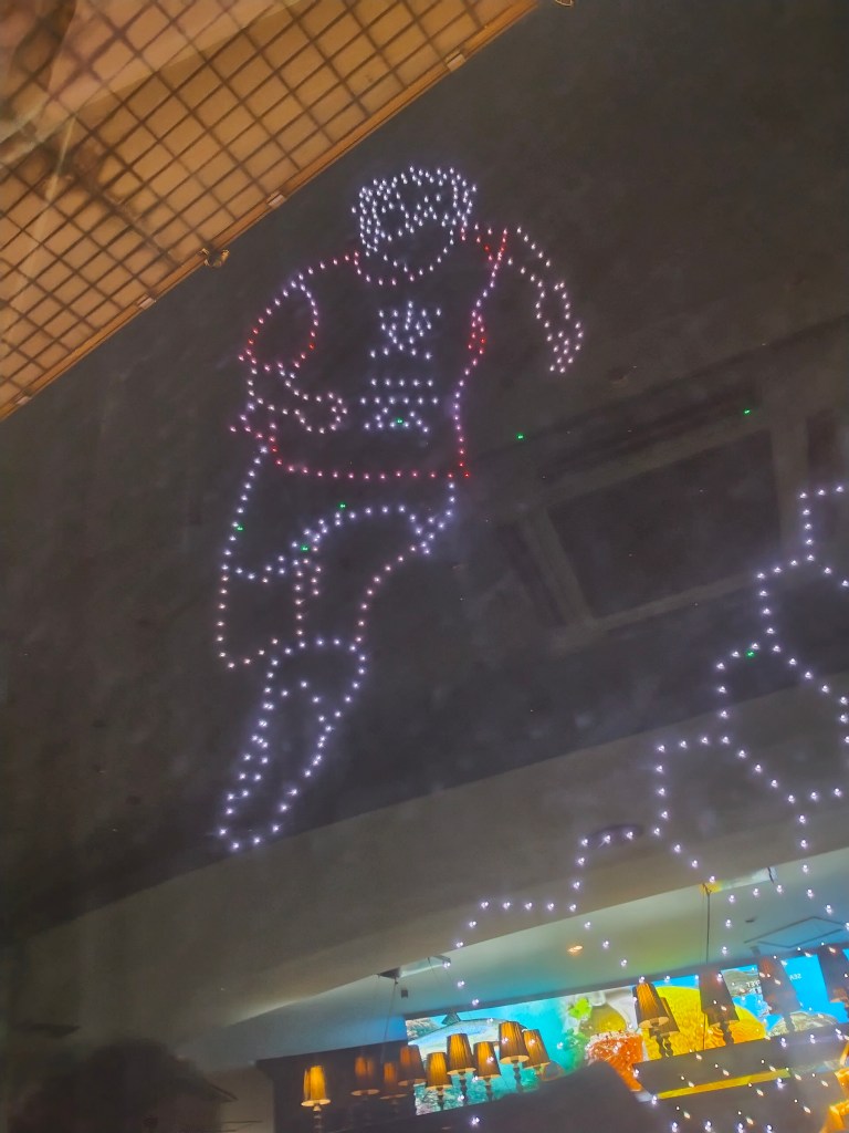 Trots den mediokra smaksensationen och den i landet relativt höga kostnaden var det en middag väl värd att minnas. Utsikten över staden var magnifik och drönarshowen som uppenbarade sig efter ungefär en timme var otrolig. Man hade ju velat se den från marknivån också.