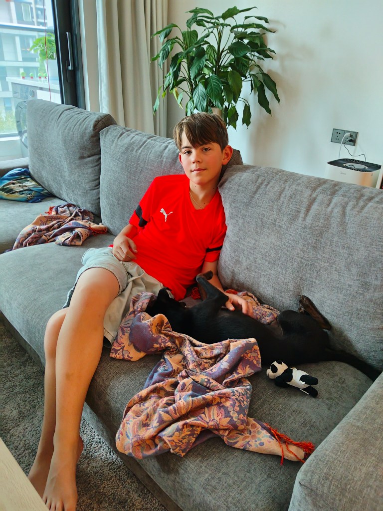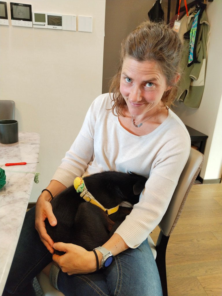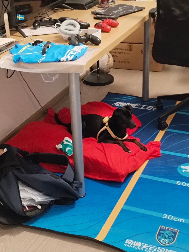 Olof fick mysa med Bosse i fredags och lördags när han var hemma sjuk. Hunden började på sitt valpaktiga sätt att nafsa och busa och fara runt. Men efter ett tag kom han till ro med Olof. Sov lugnt hela natten under Olofs skrivbord på julgardinen som blivit Bosses egna när han är här på besök.