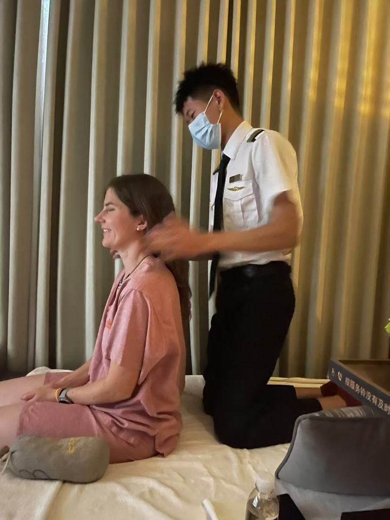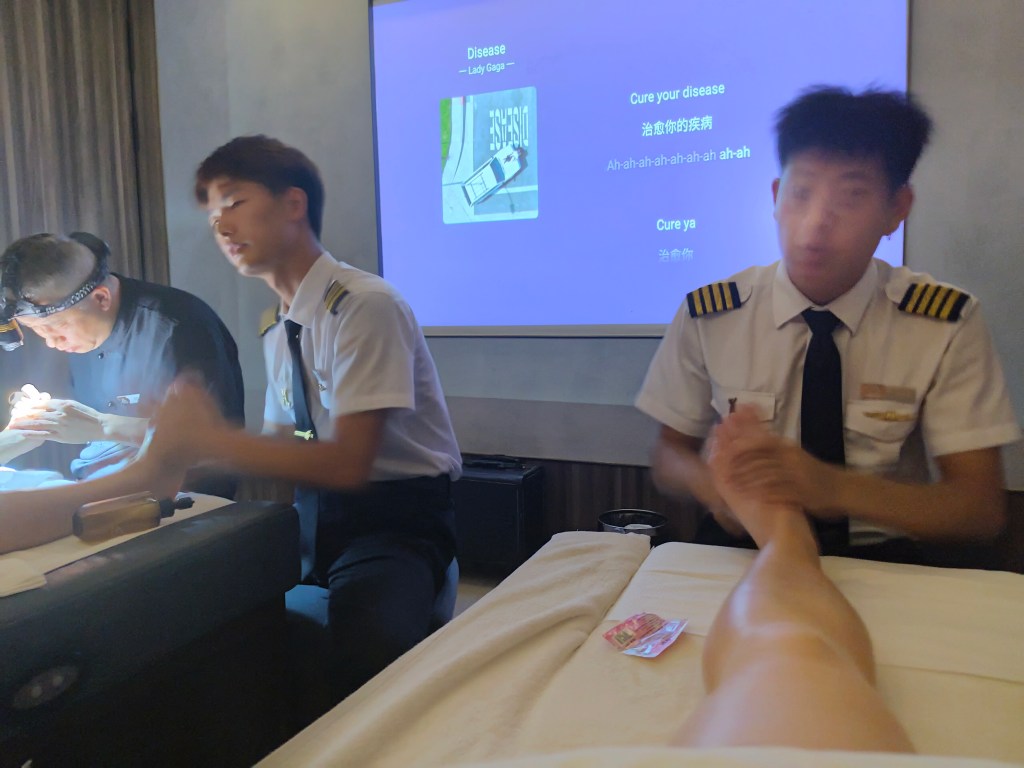 Om de tidigare massöserna sett ut som flygvärdinnor med sina chica små rullväskor, tighta klänningar och högklackat så fick vi denna gång istället två piloter. Att gå med en som talar flytande kinesiska gör att det blir en helt annan upplevelse när det går att kommunicera med massörerna och de inte bara pratar om en över ens huvud.