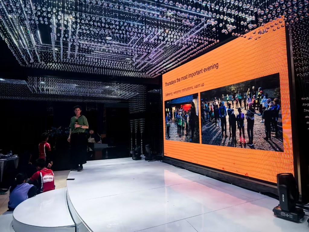 Under middagen var jag ombedd att prata lite om hur vi har klubbverksamheten i Sverige. Jag pratade först lite allmänt om rörelse och träning, att vi anser att pulshöjande aktiviteter är bra för både fysisk och psykisk hälsa, och även skolresultaten. Sun Yi, vår klubbledare informerade mig i förväg om dilemmat som uppstått om de kinesiska barnens tid där de inte hinner träna för att de har så mycket skolarbete och föräldrarna vill prioritera det.