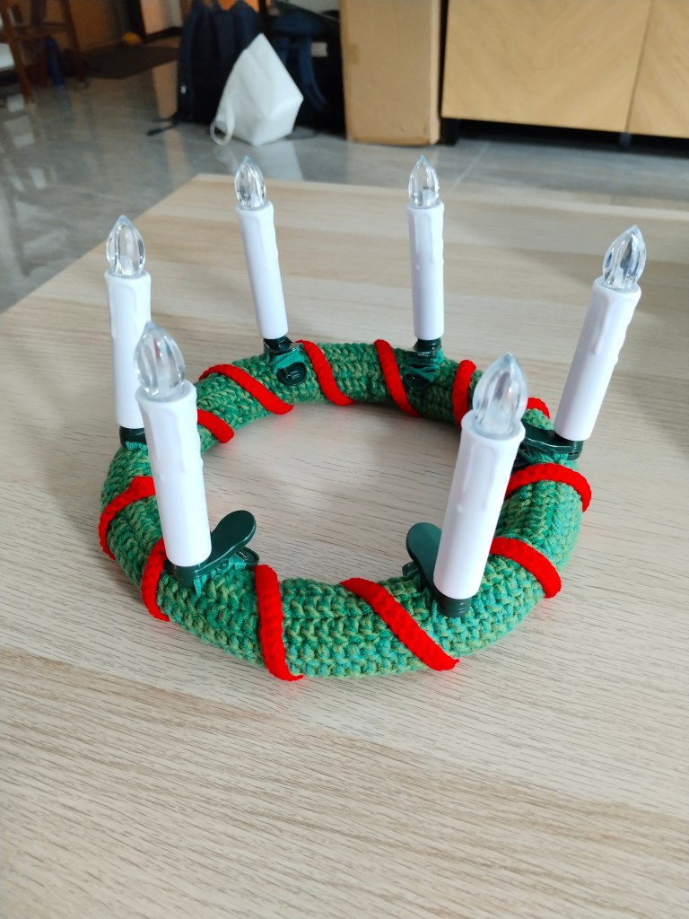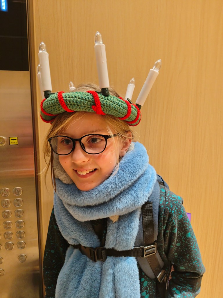 Mitt sista juliga bidrag här är min nyvirkade luciakrona med elektriska ljus. Ingrid älskade den och tog den snabbt med till sin boarding. En stjärngossestrut tror jag däremot blir svår att tillverka och svår att få gossen att bära 😅