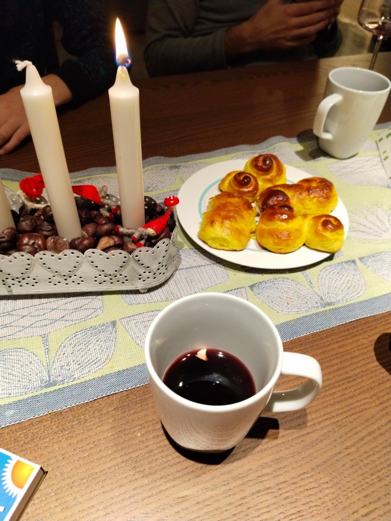 Jag hjälpte en annan familj att sy om några skolskjortor och fick en flaska glögg som tack. Det var ju något av det finaste jag fått. Har nu på IKEA inhandlat även en saftglögg, bakat lussekatter och fått 4 stearinljus av en annan familj. Så det blev ett snabbt adventsfika innan Ingrid skulle lämnas på skolan igen. Resten av lägenheten har också fått julpynt. Det gäller ju att maxa Sverigekänslan nu när det känns passande hela december.