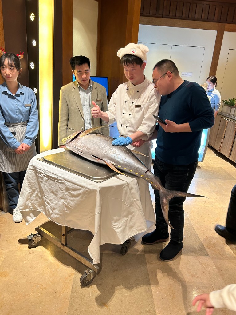 Den största delikatessen på julbordet var inte lax eller sill utan den stora tonfisken som vi fick hämta fyra skivor per vuxenbiljett av. Stor uppståndelse och kö när fiskmästaren gick loss på fisken.