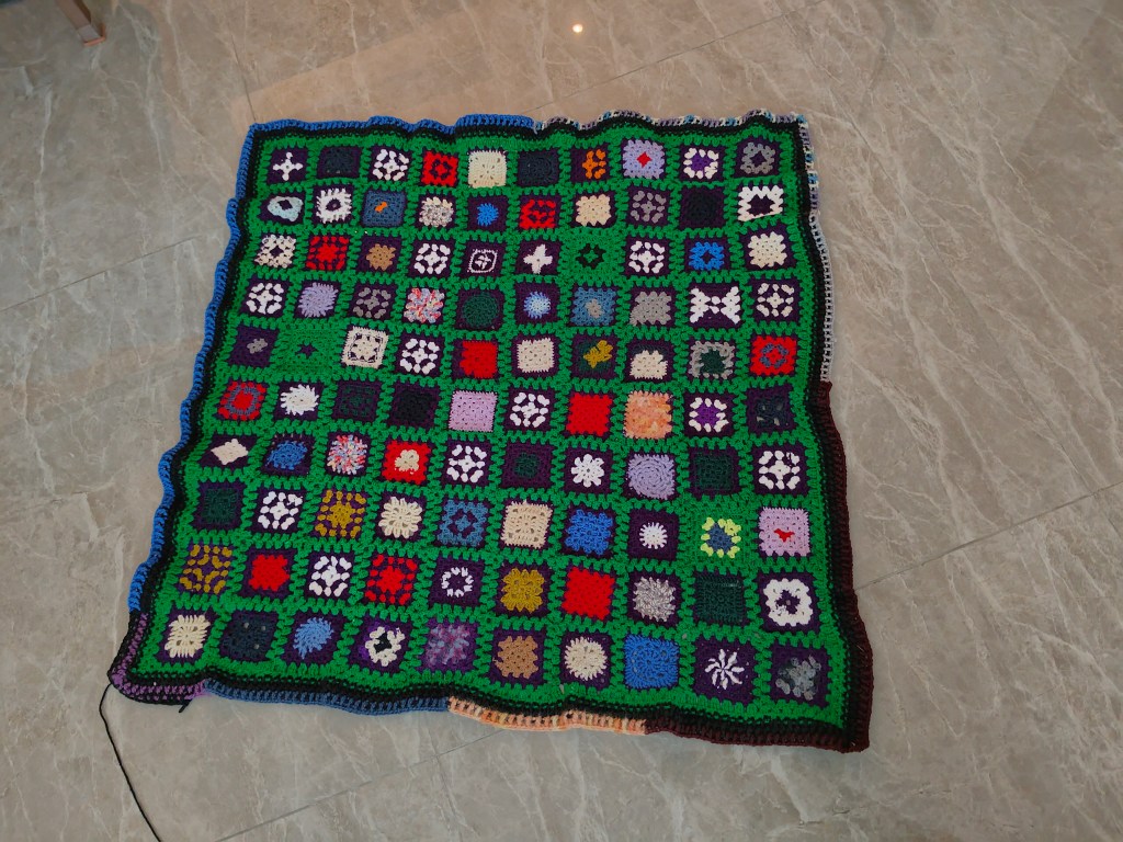 Alla mormorsrutor som jag snott ihop i bilen under våra resor de senaste åren har samlats i en påse som fick åka med till Kina. Nu har det äntligen blivit en filt som jag kantar ihop med både nytt och gammalt garn.