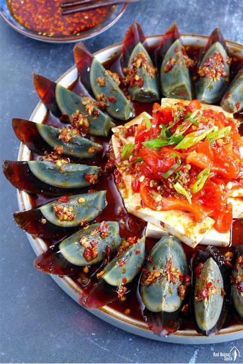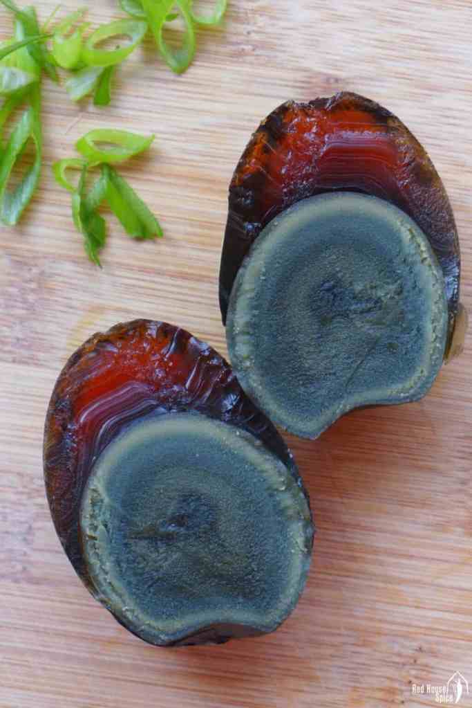 Dessa bilder är stulna från nätet, jag glömde ju att fota de vi åt, men äggen har legat i en blandning av lera, aska, jord, hö under ett antal veckor (alternativt en modernare sur lösning) för att proteinerna ska denatureras på ett annat vis än vid kokning och ge denna annorlunda färg. Konsistensen är väldigt lik vanliga kokta ägg. Smaken dock lite fränare.