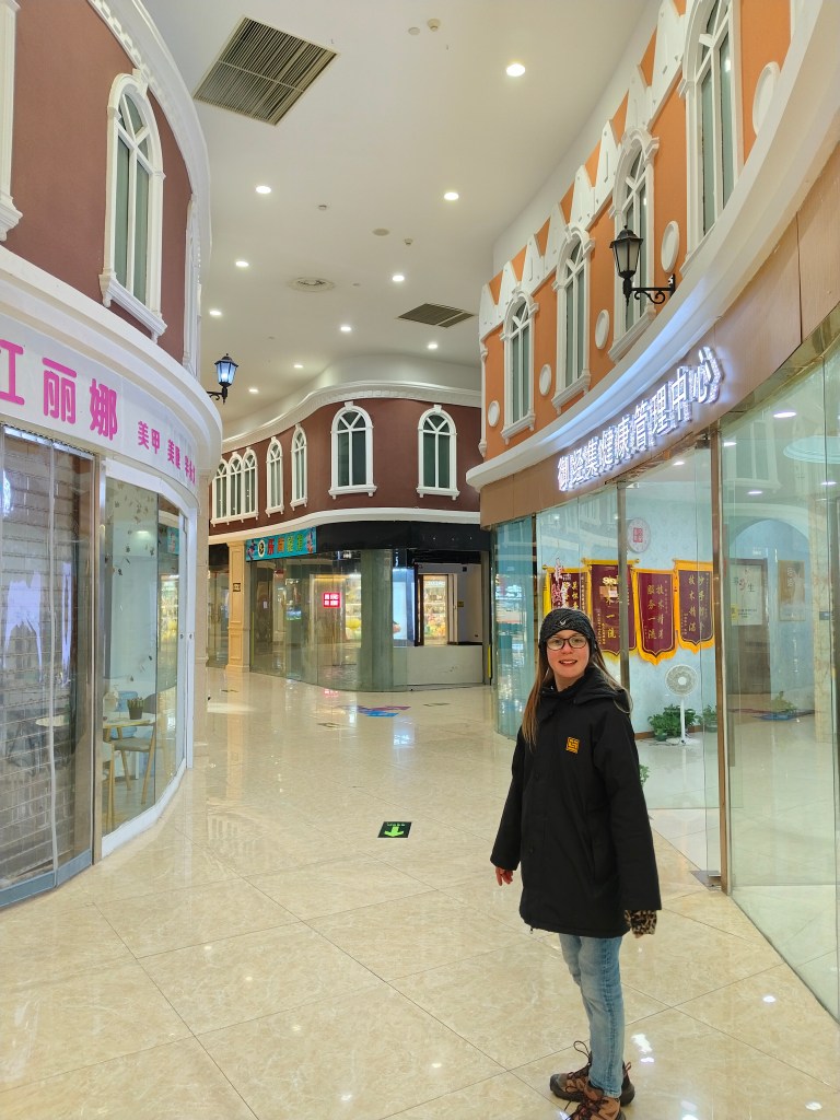 Ingrid stannar till i en shoppinggata under jord. Mysig inredning med fasader i taket. Just här var taket visst vitt, men längre bort var det blåmålad himmel med molntussar på.