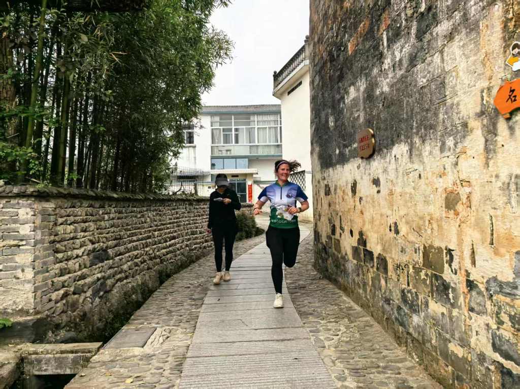 Sträckan gick från en liten by till byn där vi bodde, ca 500 meter ifrån varandra. Stenlagda gränder övergick i rätt fuktig åkermark, teplantage, bambuskog och odlingar. Det gällde att sätta fötterna rätt, och beslutet att gena över åkern var inte det bästa då det resulterade i att jag fick klättra uppför en vassbevuxen brant och nästan tappade nummerlappen. Vid ett tillfälle låg jag ca 20 meter bakom en man i min egen ålder, jag hörde honom ramla, stöna och ta sig upp igen. Det stoppade däremot inte mig från att springa rakt ut i samma grop, ramla, stöna och ta mig upp igen. Mannen kom fram efter målgång och bad om ursäkt att han inte varnat mig tillräckligt 🙂