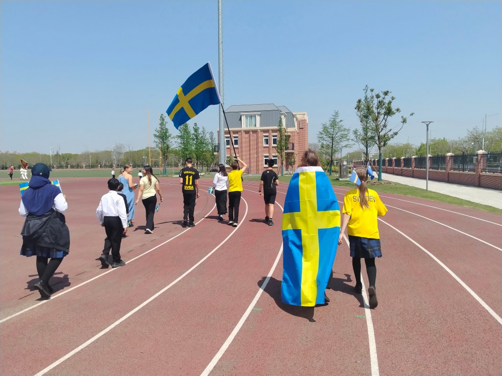 Utställningen av klasserna var en del av den internationella dagen, flaggparaden var en annan del. Alla länder som representeras på skolan genom lärare eller elever fick paradera runt med flaggor och en av flaggbäraren utvald låt. Olof var av skolledningen utvald att bära Sveriges flagga, och han satsade på Dancing queen som den svenska låten