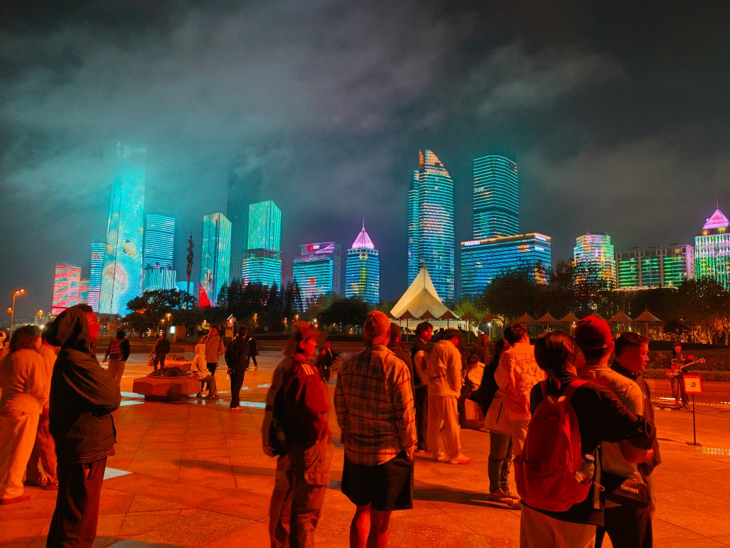 Kvällarna nere vid vattnet bara några hundra meter från hotellet var väldigt fina. Jag kunde räkna till 38 byggnader minst som var med i detta ljusskådespel från mörkrets inbrott tills klockan slog 22. Kina är ändå vackrast på kvällen och inte en regnfuktig morgon efter några timmars pålandsvind..