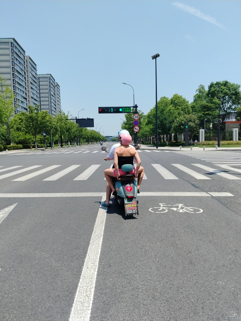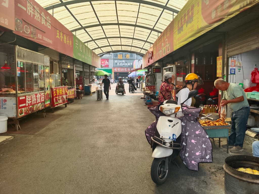 På ett riktigt kinesiskt vis fick Albin gladeligen köra E-bike fram och tillbaka, och lunchen blev en grönsakspannkaka från en foodtruck längs vägen.