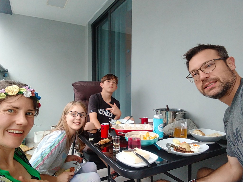 Fika med bubbel och dans runt stången utanför biblioteket efter en midsommarlunch på vår balkong. Det bkev lite andra planer än parken i och med att regnet hällde ner.