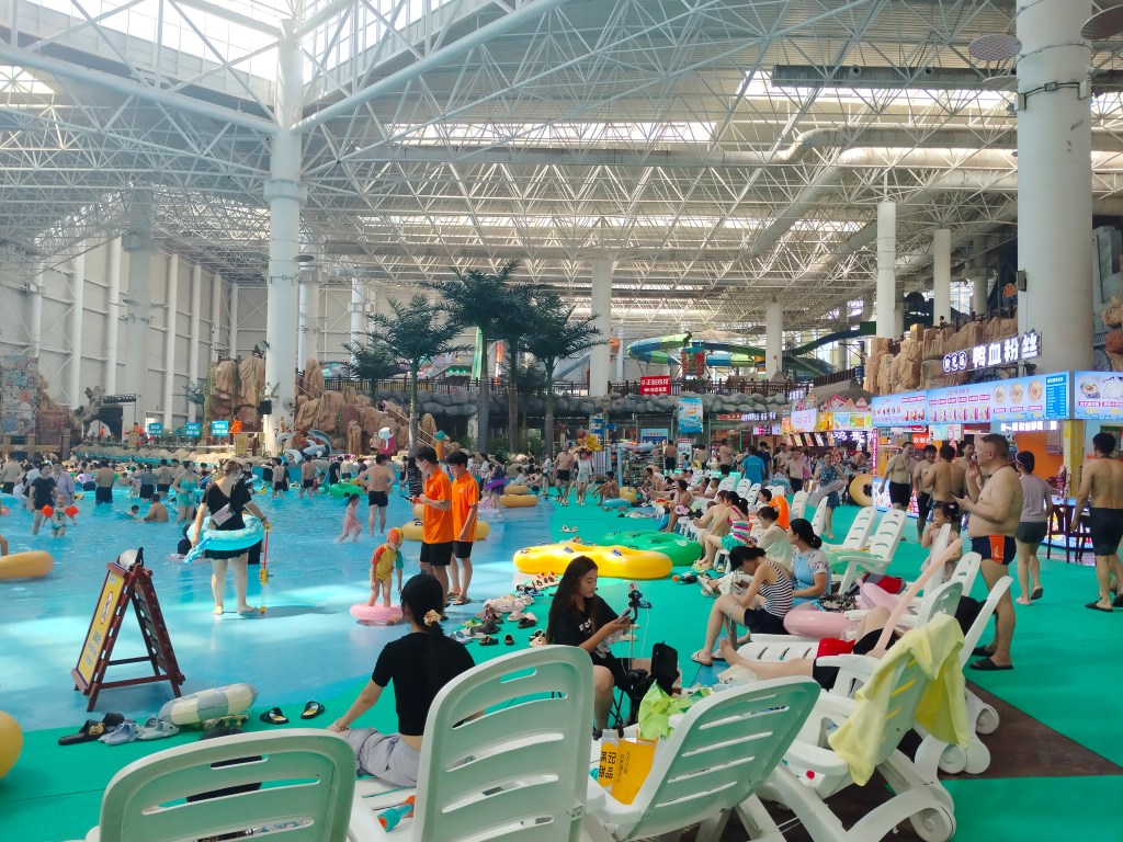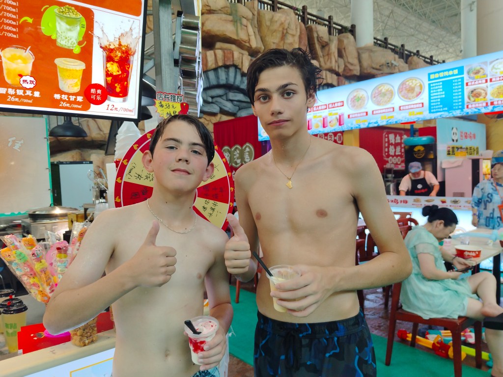 En annan utflykt vi tog var till Nantongs vattenland. Att komma in var även denna gång ett äventyr i sig. Vid spärrarna in stod tre ganska sysslolösa men hjälpsamma tjejer i 20årsåldern. Jag skickade över telefonen och sade snälla hjälp. De klickade fram och tillbaka mellan olika appar och lyckades köpa 3 biljetter, det var gränsen. Med Milos telefon försökte vi köpa en till biljett, det gick inte. Med Olofs telefon gick det heller inte, och oavsett vilket var nästa steg att leta upp en container utanför området för att omvandla våra tre elektroniska biljetter till pappersbiljetter och köpa en fjärde biljett. Suck!